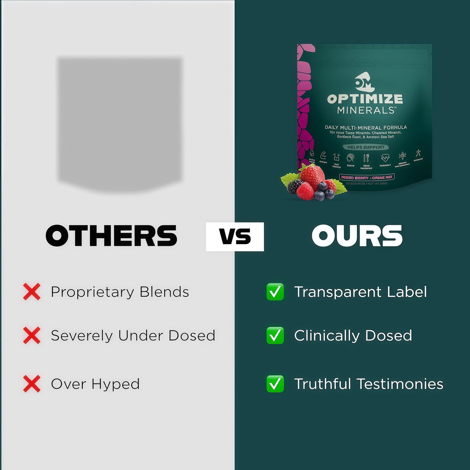 At Optimize Minerals, we do things differently. Our Daily Multi-Mineral Formula is made with a transparent label, clinically dosed ingredients, and a formula you can trust—so you know exactly what you’re putting in your body every day.